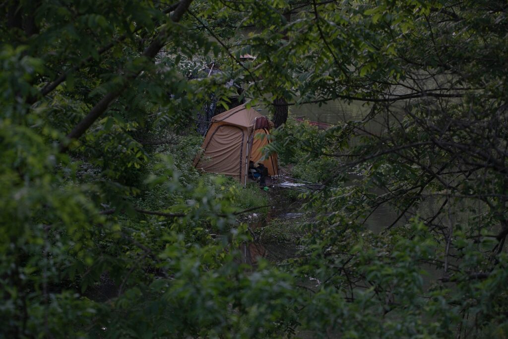 水辺にテントを設営できる場合はテント内から釣りができたりします。