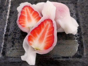『あきひめ』を丸ごとひと粒といちごあんを求肥で包んだ傑作です。もっちりとした食感の中からあらわれる、イチゴの甘酸っぱさといちごあんのあっさりとした甘みが絶妙で、いくつでも食べられてしまうおいしさです。