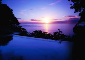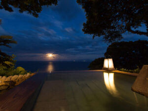 和月の露天風呂では、木漏れ日や鳥のさえずり、風の香りを感じながら眼下に広がる海の景色を お愉しみいただけます。自然の息吹が旅の疲れを癒し、心と身体を優しく解きほぐしてくれます。