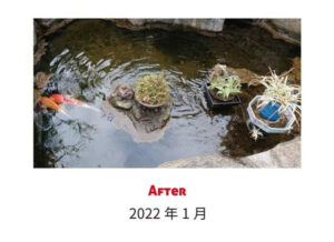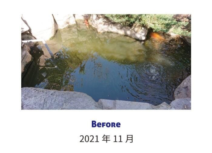 水を抜いてもきれいにならず困っていた池に、週に1回Cube7〜8個(35〜40g)投入して約3ヶ月でこんなにきれいになりました!お寺の方も非常に喜んでいただきました。