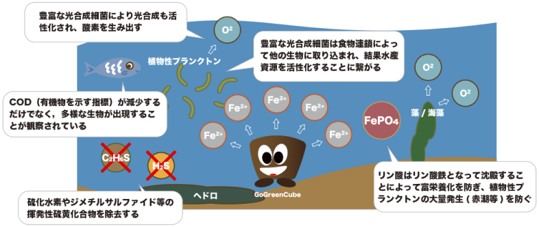 二価鉄イオンがヘドロに反応することで、悪臭を抑制し水質を改善します。また食物連鎖の最下層に位置する、植物性プランクトンの生育に適した環境を作るため、 水生生物にとって理想的な水環境を維持します。