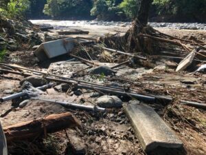 ロッジの安否を気遣い管理者の野呂さんは、できる限り6っ時の管理棟に留まりましたが、20時ごろ、上流側にあった物置やヘリコプターが濁流に流されていくのを確認し、「ここにいるのは危険」と判断。泣く泣く避難する形となったそうです。