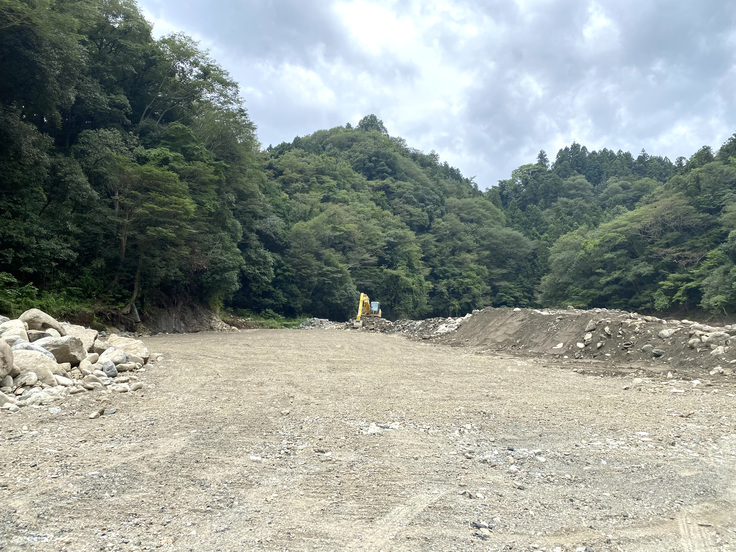 増水となってもより災害に強いキャンプサイトの構造にしました。令和元年の台風被害、今回の被害で場内の石砂利については下流に流され少なくなってしまったことで洪水からキャンプサイトを守る高さを作るのが難しくなりました。そのため、秋の台風シーズン対策として2階層目にあるテントサイトの上流方面に石砂利の堤防を作りました。