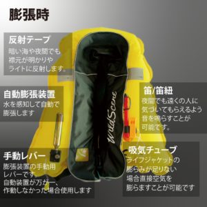 入水時に中の浮き袋が自動または手動で膨らむ仕様となっている。つまり、