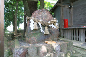 オオクニヌシを生き返らせたキサガイヒメとウムガイヒメは舞阪の氏神様、岐佐神社の神様としてまつられています。オオクニヌシの命を奪ったとされる赤石もお社の西側にまつられています。
