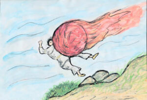 しかし、嫉妬に狂った兄達は、オオクニヌシを殺そうと企みます。兄達は、オオクニヌシに赤いイノシシを退治するよう命じ、オオクニヌシは山のふもとで待っていました。兄達はそこに、赤く焼いた大きな石を転がして落としたのです。オオクニヌシは、焼けた石に巻き込まれて死んでしまいます。