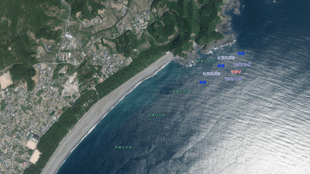 遠浅の地形ですので、波が割れるところの地形周辺を狙っていくのがよいです。
