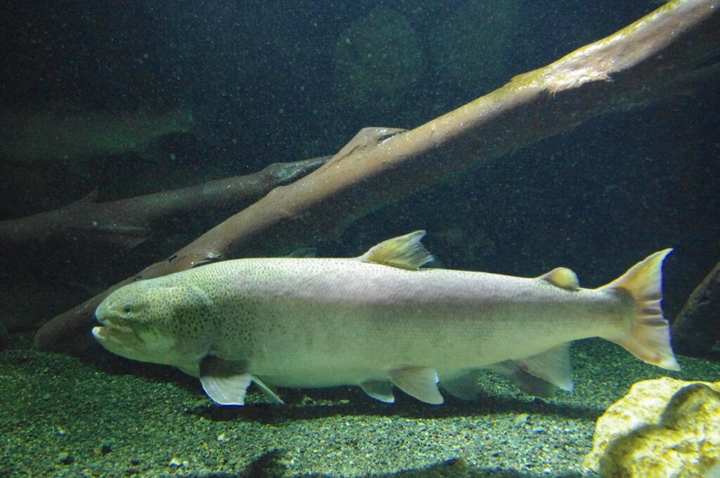 イトウは北海道を生息地としているサケ科の魚。淡水魚の中では大型な種類になります。大きなもので1m~2mを超えるような大型の個体がいます。模様の特徴は、背中側が青みがかっています。そこに黒の斑点がたくさんあるのが特徴です。ニジマスに少し似ているので、間違いには注意が必要です。