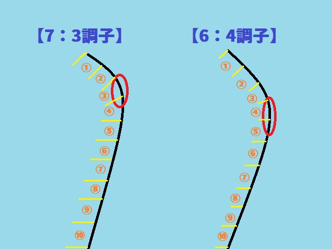 先から4番目で曲がる竿を6:4調子、先から5番目(まんなか)で曲がる竿を5:5調子といいます。