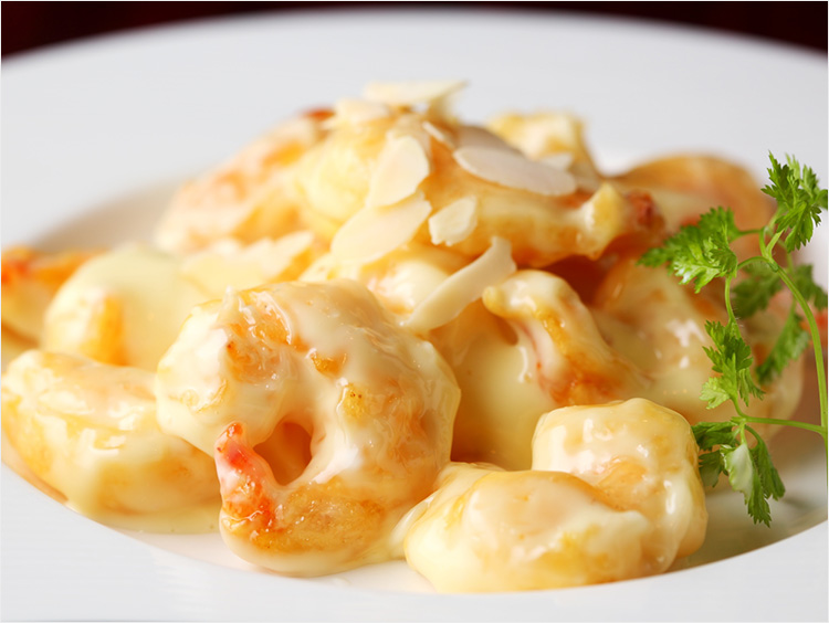 “海老マヨ”は、揚げた海老にマヨネーズソースをまとわせた香港生まれの名菜である。