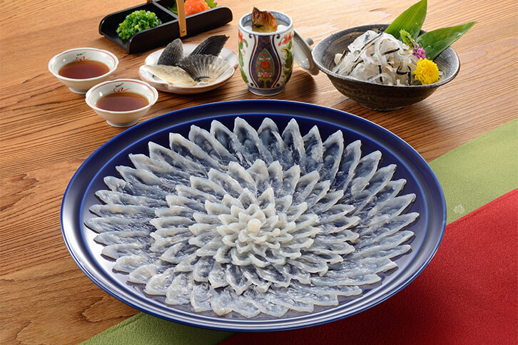 プリプリしたふぐの食感や口に入れた時の何とも言えない旨味をシンプルに楽しめるふぐ刺し。