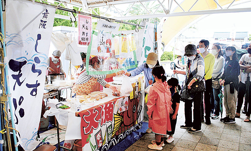 日本屈指のしらす漁で知られる舞阪港からほど近い弁天島海浜公園で開催され、その日に獲れた生しらすや、海の幸、地元の美味しいモノが販売されます。また、地元の女性達が作る出来立ての料理の数々を食べる事ができま す。