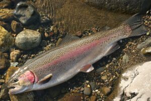 ニジマスは、淡水魚の中でも比較的大型になり、荒々しい食性をしているため、釣りの対象魚としても人気です。野生、または野生化したニジマスは引きが強く、大物は釣り人の憧れとなっています。
