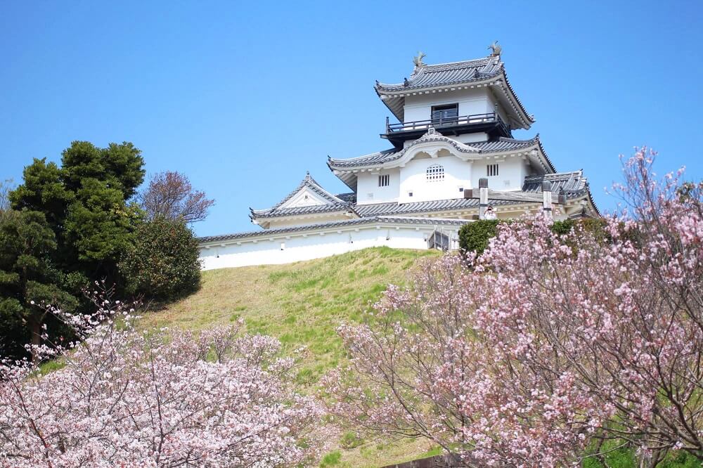 山内一豊と内助の功で知られる妻お千代ゆかりの掛川城周辺には、カケガワザクラ、四季桜、しだれ桜、ソメイヨシノなど約150本の桜が植えられており、3月初旬から徐々に開花し、長い期間桜景色を楽しむことができます。大手門をくぐってすぐの枝垂桜と天守閣や、石段沿いの染井吉野と天守閣は、人気の撮影スポット。天守から見下ろす掛川城御殿や花公園の桜も素敵です。「東海の名城」とうたわれた掛川城と華麗な桜が調和して、格別に美しく見えるこの季節に、ぜひお出かけください。