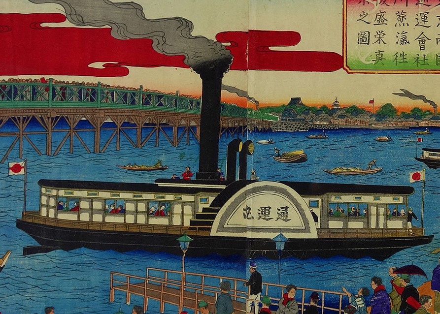 明治の後半には日本の河川に蒸気船が走るようになり、貨物の概念が変わるとともに、一般人も『客船』として船を利用するようになる。今までは交通の手段でしかなかった川がそこに『楽しみ』を見出した時代である。