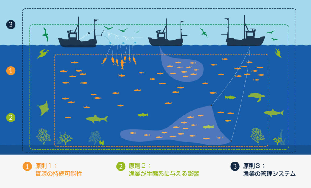 MSCの漁業認証規格漁業の持続可能性を測定する一つの手段であり、漁業が審査される際は以下の3つの原則が考慮され判断が行われます。