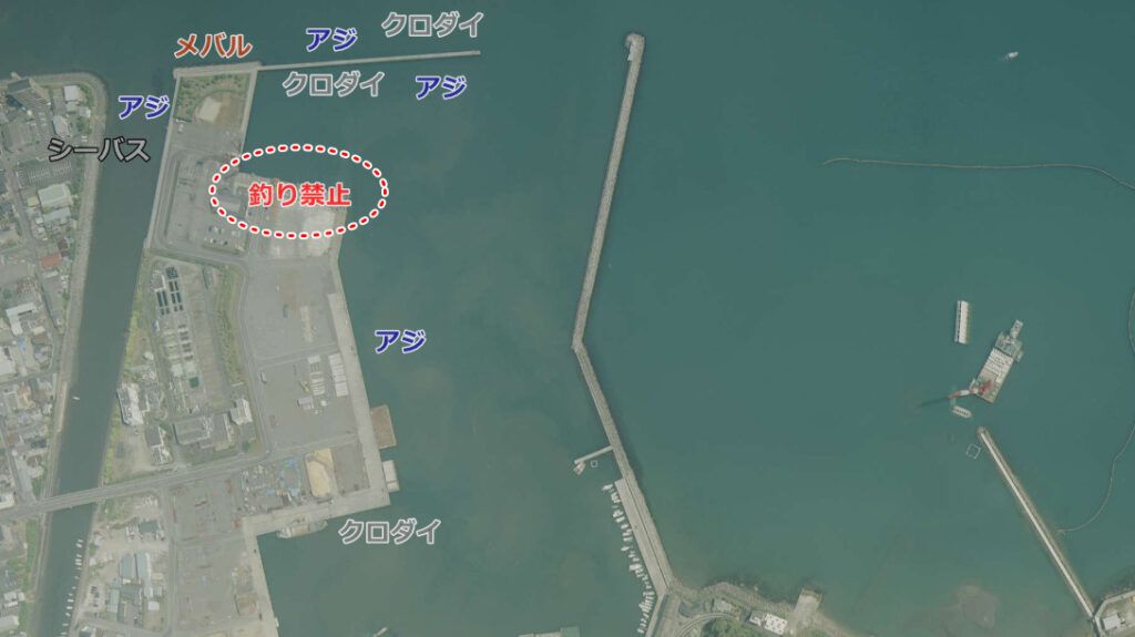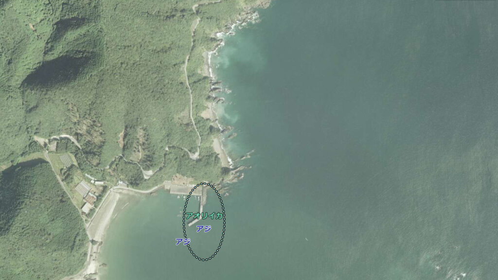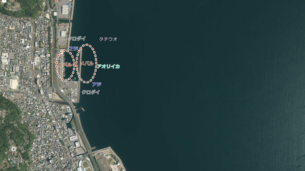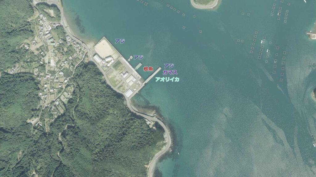 北西の風をかわすポイントです。冬の風の強い日などに賑わい、アオリイカ、カサゴやメバルなどの根魚が釣れます。
