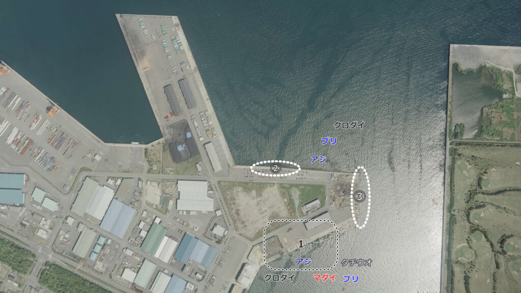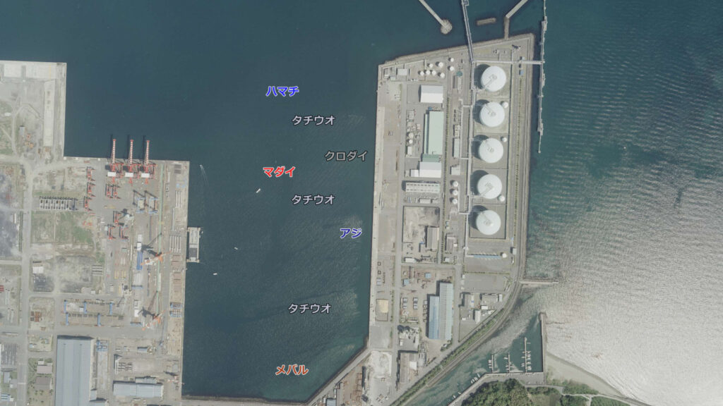 青物を狙う場合には、「発電所」の北側にあるテトラや波止先端付近から沖に向かってキャスティングして狙うとよいでしょう。