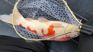 この釣り堀が大人気で、ターゲットは高級金魚の「玉サバ」と錦鯉です!