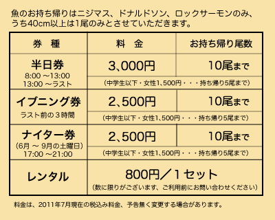 | 釣り堀1時間 | 1,200円 延長する場合は、別途釣り堀利用時間延長券をご購入ください。 |