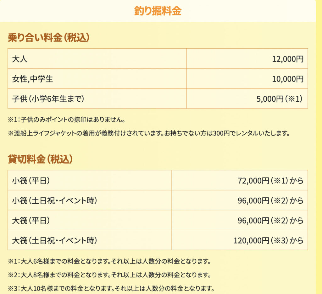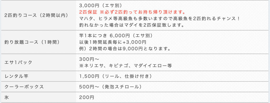 「貸切」や「釣り筏」など詳しい料金は「フィッシングパークトリトンHP」まで!