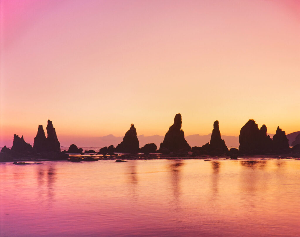 海の中に、約850mの大小40ほどの岩柱が列を成して立っています。