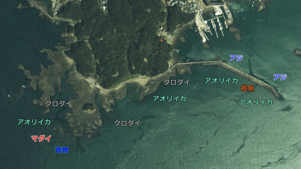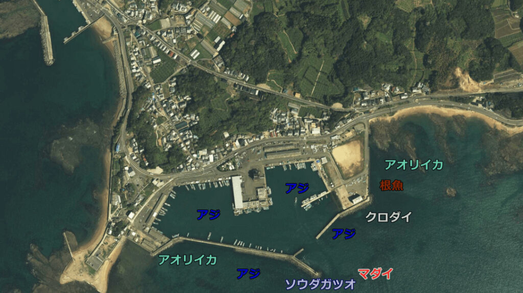 足場はよく湾内ではサビキ釣り、波止先端ではアオリイカや根魚を狙うとよい。