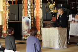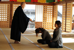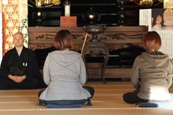 まず、僧侶より坐禅の説明をします。結跏趺坐(けっかふざ)の足の組み方や姿勢など丁寧にお教えします。目を閉じ、ゆっくりと呼吸を整えましょう。静寂の中に、やがて鳥の声や木々のささやきが聞こえてきます。