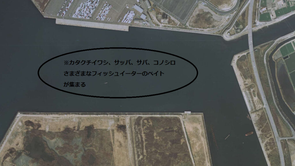 火力発電所の側に開放されている碧南釣り広場。3つの排水口があり、冬場も温排水のおかげでフィッシュイーターが集まります。